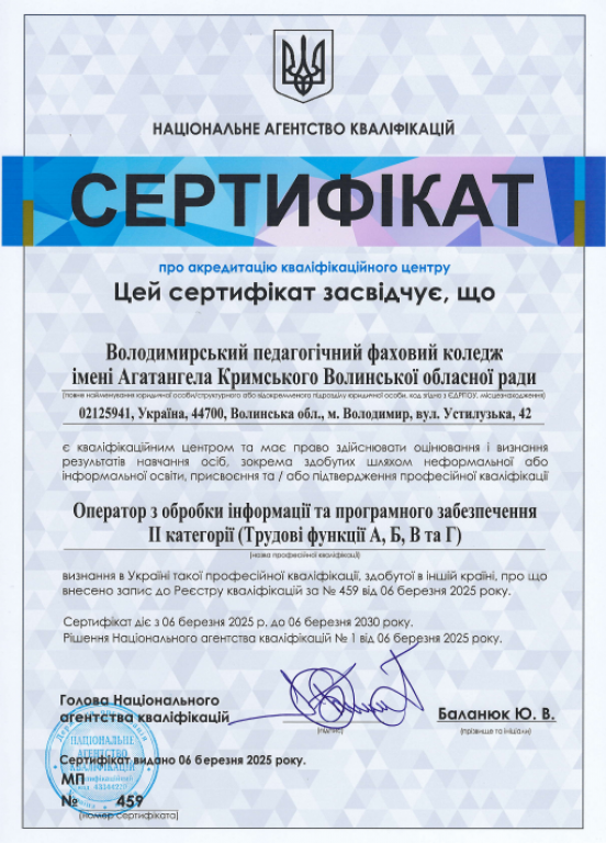Володимирський педагогічний фаховий коледж імені Агатангела Кримського Волинської обласної ради офіційно отримав статус кваліфікаційного центру. Це підтверджується Сертифікатом про акредитацію кваліфікаційного центру, виданим Національним агентством кваліфікацій.