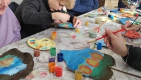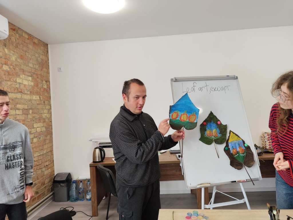 Під час заняття вихованці створювали розпис на сушених листках — це один із видів декоративного мистецтва, де природний матеріал виступає основою для малюнків, орнаментів або навіть мініатюрних композицій.