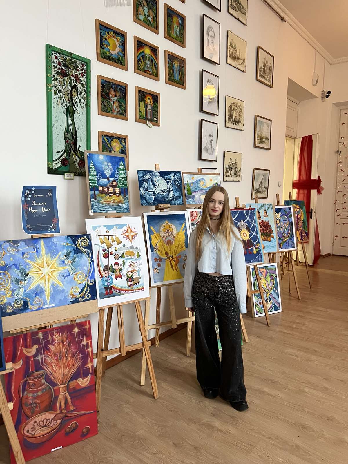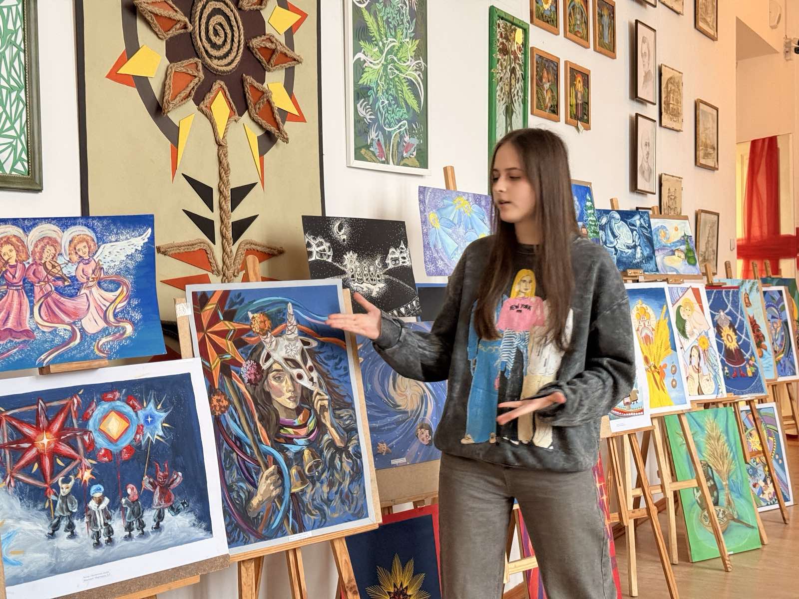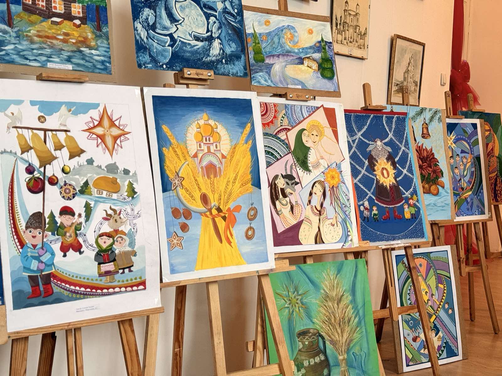 Роботи на виставці вражають різноманіттям сюжетів, образів і художніх технік, що свідчить про творчу активність та індивідуальний підхід кожного автора. Композиції «Зоря», «Де Коза ходить, там жито родить», «Небо і земля нині торжествують», - розкривають різдвяно-новорічну тематику і доводять, що Різдво – це дуже красиве і радісне свято, яке з нетерпінням чекають дорослі і діти. Водночас помітною була присутність авторських ідей – казкові персонажі, фантазійні сюжети, поєднання сучасних і народних образів. Особливу увагу привертало колористичне вирішення робіт. Учасники вдало використали холодну зимову гаму (блакитні, сріблясті, фіолетові відтінки), поєднуючи їх з теплими акцентами (червоний, жовтий, золотистий) що створювало святковий настрій та емоційну виразність композицій.