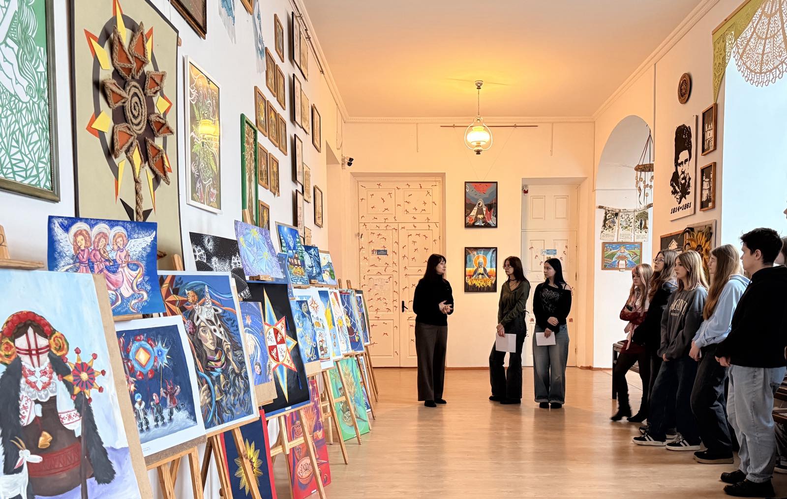Виставку відкривали ведучі Вікторія Мартинюк та Любов Рак. Сидорук Ольга, Сюмак Іванна, Оганова Софія, з задоволенням розповідали про власний творчий шлях до реалізації ідеї тої чи іншої композиції. Назви робіт «Трії царі несуть дари», «Переплетення віків», «Дідух» красномовно розкривають зміст авторських робіт. Для студентів такі виставки є гарною нагодою творчого спілкування, аналізу досягнутого, прагнення до удосконалення та здійснення мети, уміння презентувати власну творчість і цінувати працю інших.