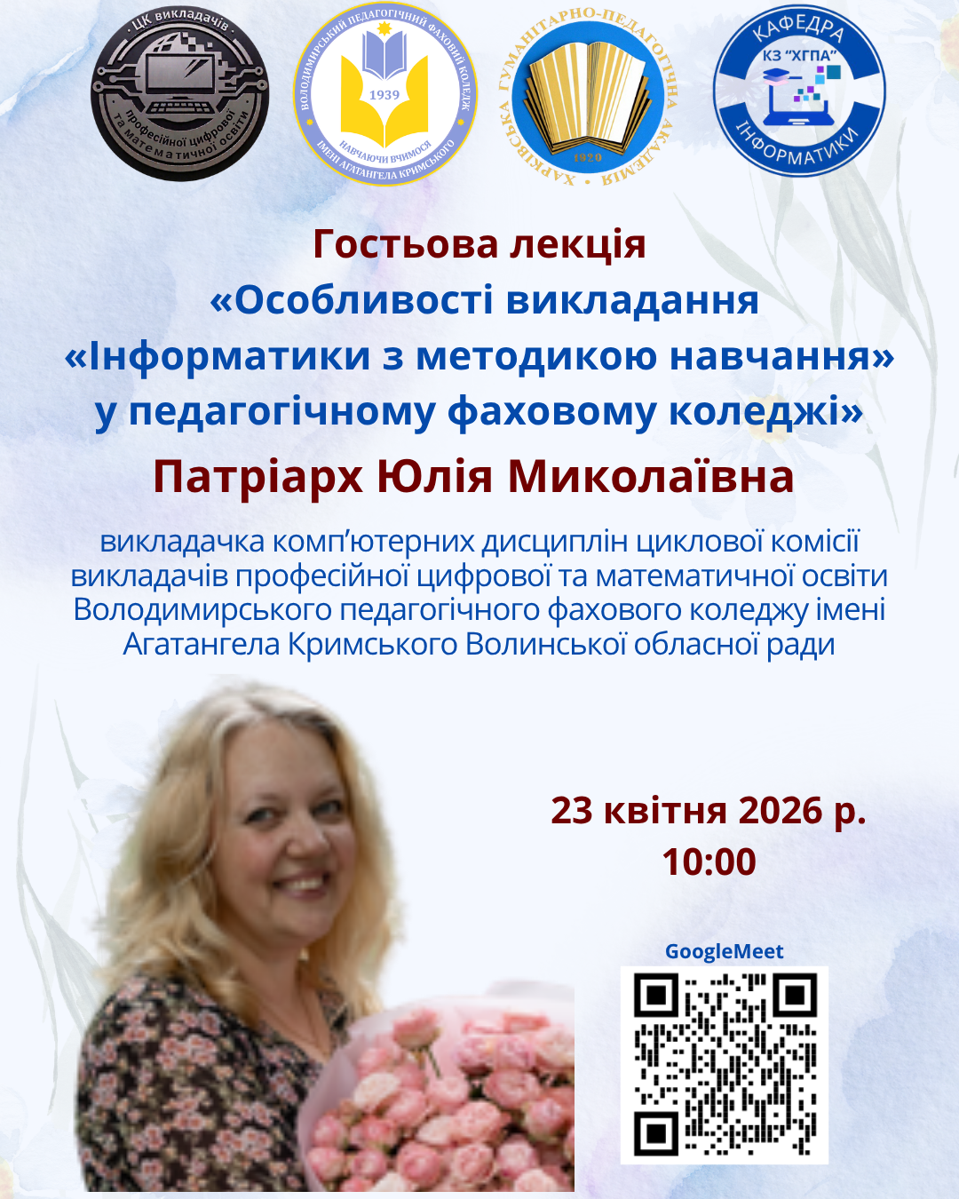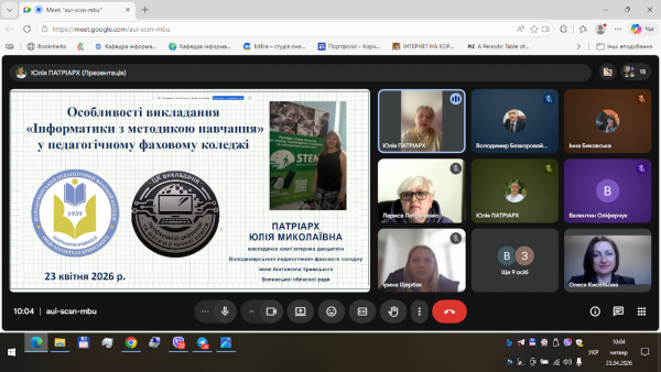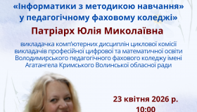 23 квітня 2026р., в рамках тижня циклової комісії викладачів професійної цифрової та математичної освіти на запрошення кафедри інформатики КЗ «Харківська гуманітарно-педагогічна академія» Харківської обласної ради викладачка комп'ютерних дисциплін Володимирського педагогічного фахового коледжу імені Агатангела Кримського Волинської обласної ради Патріарх Юлія Миколаївна провела гостьову лекцію в межах Весняного науково-методичного марафону «Досвід навчання інформатики в сучасних умовах».
