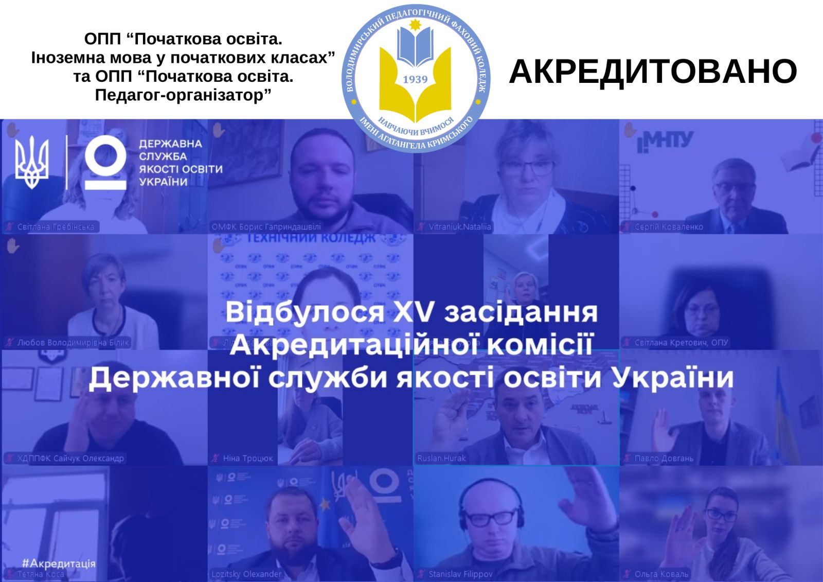 Володимирський педагогічний фаховий коледж імені Агатангела Кримського Волинської обласної ради успішно пройшов акредитацію двох освітньо-професійних програм: «Початкова освіта. Педагог-організатор» та «Початкова освіта. Іноземна мова у початкових класах».